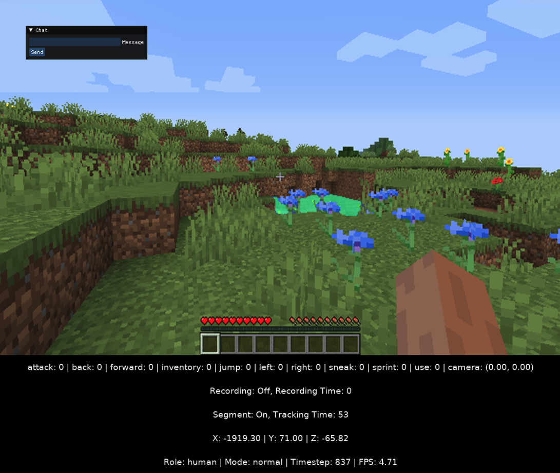 A window will pop up like this, and you can start playing Minecraft in the GUI. When action in sim.step(action) is None, the player will be controlled by the keyboard or a callback function.